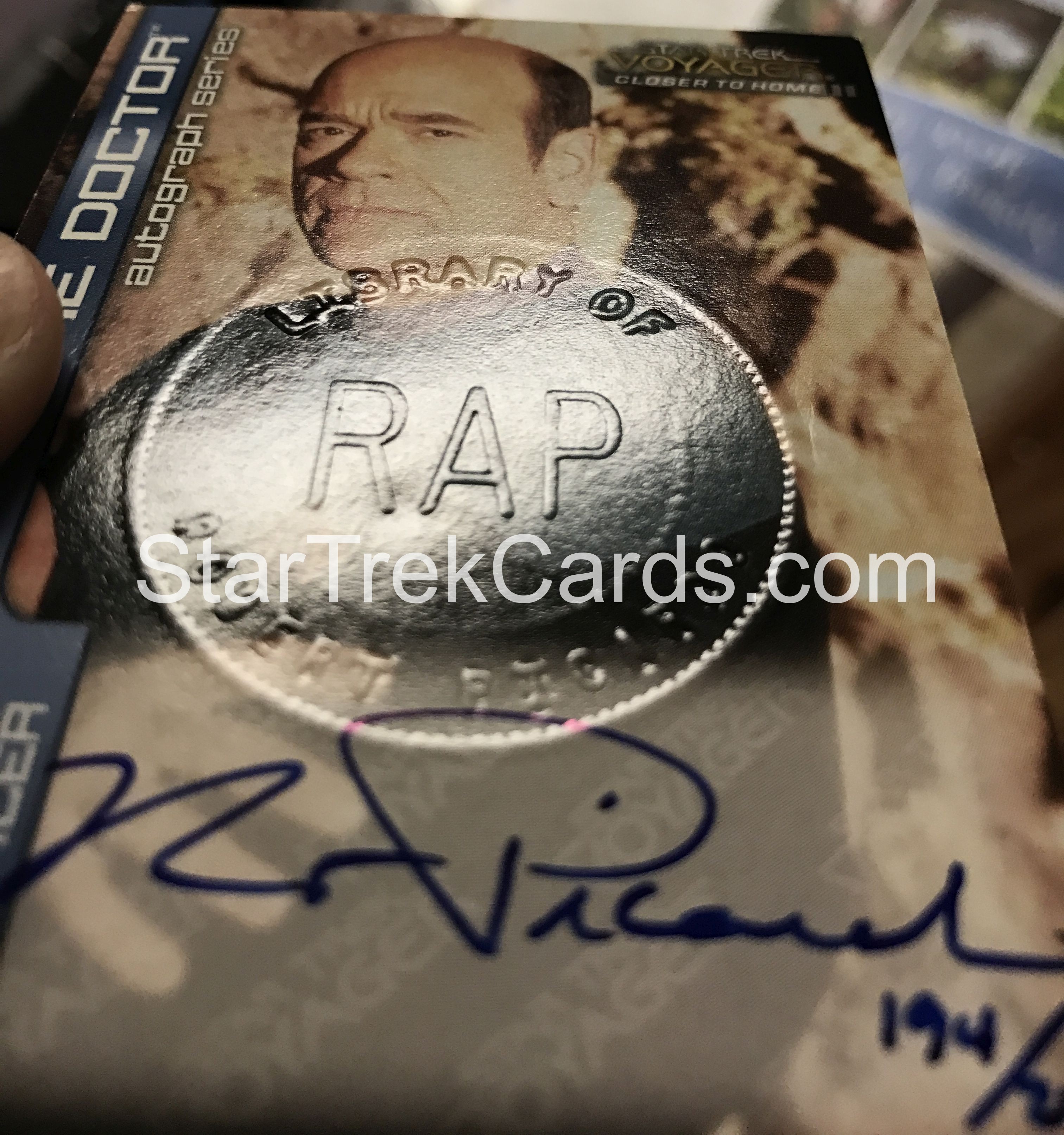 This card was hand numbered on the front of each card by Robert Picardo. It also has an embossed seal that is different from all the other autographed cards in this set. The normal seal says "Seal of Authenticity Skybox" vs the seal on this card which says "Library of Robert Picardo RAP". This card was probably not pack inserted and instead provided to Robert Picardo to personally hand out. |